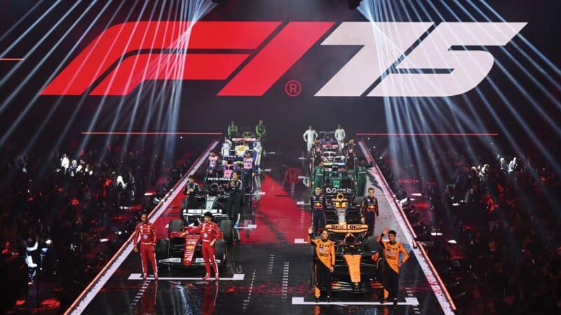 Celebrating 75 years of the world championship, each team is given a seven-minute slot to show off their new car colour-scheme, do some brand promotion and give sponsors their money’s worth. There will be live music too at the 15,000-capacity event; it’s all a long way from taking the covers off a new car in the Silverstone pitlane.