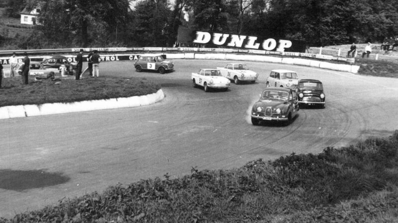 Class-winning Saab 96 leads Minis and BMW 700s round Mallory Park hairpin in the 1964 Motor National Three Hours, second round of that year’s European Touring Car Challenge