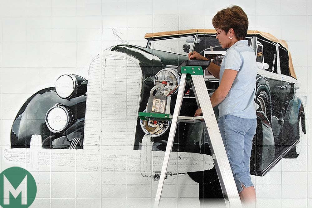 Bobbie grew up within the Detroit area – her first car was a Mustang – but while painting was always an interest it only became a vocation after she had brought up a family, when she went to the University of Tennessee School of Art. Her work is wide-ranging: as well as portraits and teaching workshops she also does courtroom sketching. But it is the murals that set her apart: she has painted more than 100 of them for restaurants, service stations and private garages, ranging in size up to 35 feet across.
