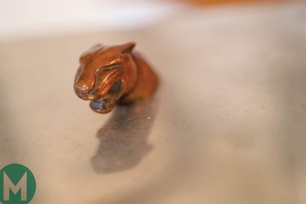 “This is the only thing that survived the fire,” says Nigel Webb handing me a small, but weighty piece of a Jaguar emblem, cast in solid bronze. “It’s the top of what used to be Mike’s ink blotter, used for signing his name on official papers. The fire destroyed everything else, which is tragic. Imagine how packed this place could be had the vast majority of the Hawthorn legacy not been ordered burned…”