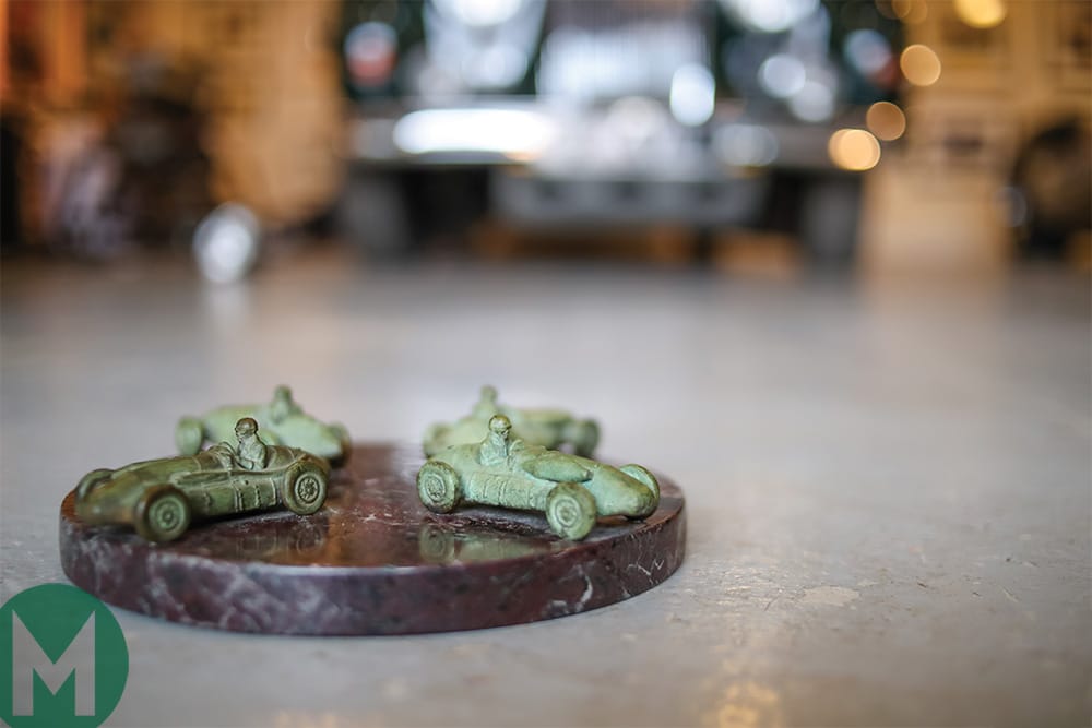 One standout auction find is the base of Hawthorn’s 1958 Formula 1 World Championship trophy, which Webb won at a Sotheby’s sale. Forged from solid marble with four brass racing cars mounted on top of it and the holes where the four supporting pillars would have been still visible, the trophy was ordered broken up after his death. Only the base remains.