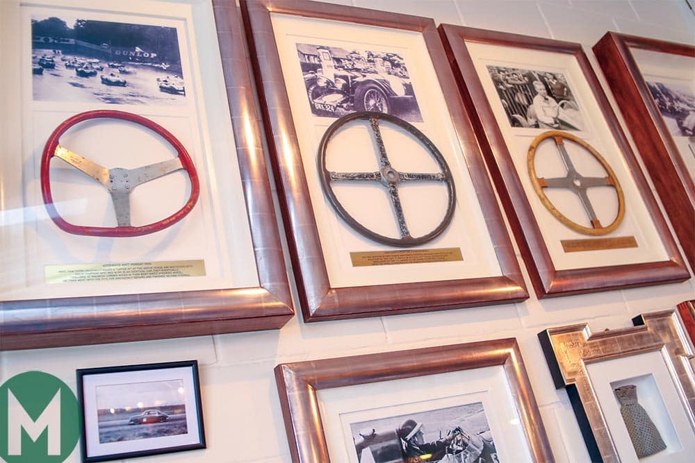 Webb’s collection of ex-Hawthorn steering wheels, including a bent Lotus 11 one from an accident at Goodwood