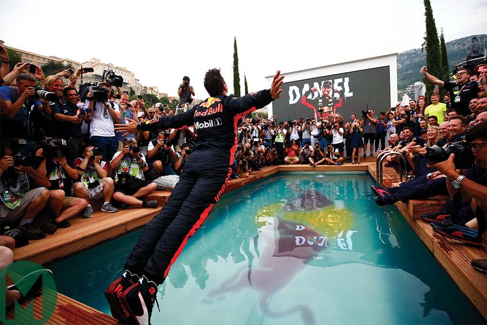 Back when it all looked rosy. Daniel Ricciardo plunges into Red Bull Racing’s Monaco pool to celebrate his second victory of the season, but things later went wrong