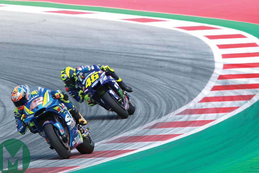 Alex Rins leads Valentino Rossi on his Suzuki at the Red Bull Ring, Austria