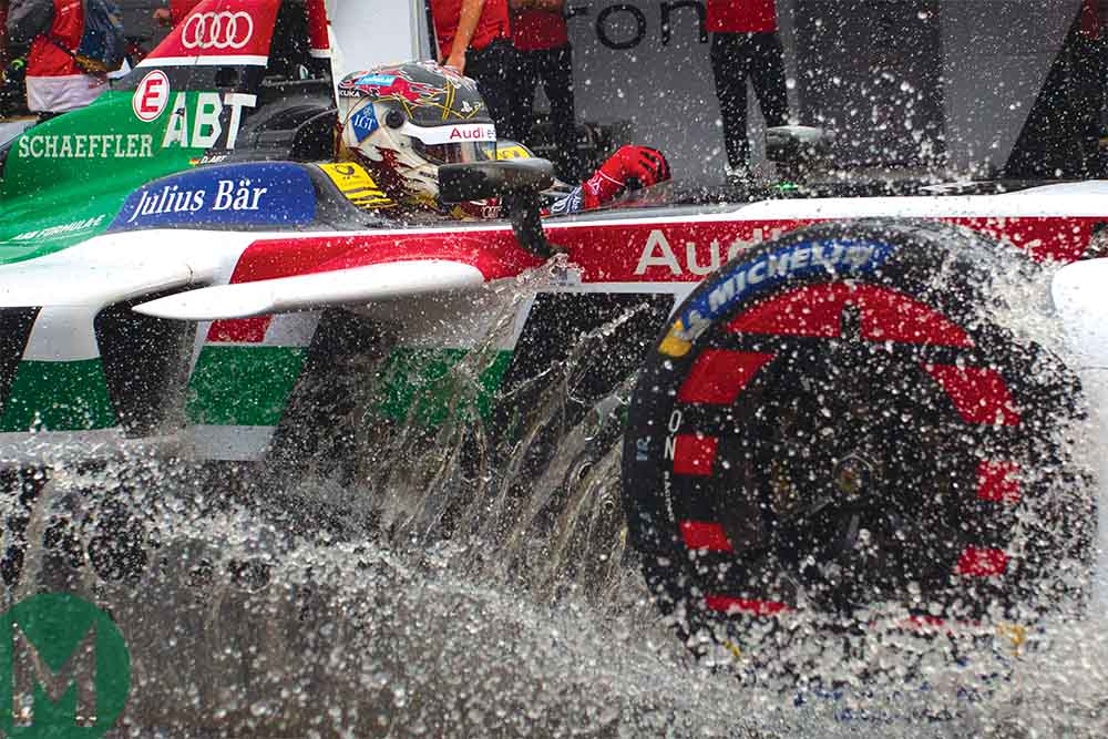 Water in the electrics: Daniel Abt splashes his way around the New York Formula E circuit, in the Red Hook area of Brooklyn
