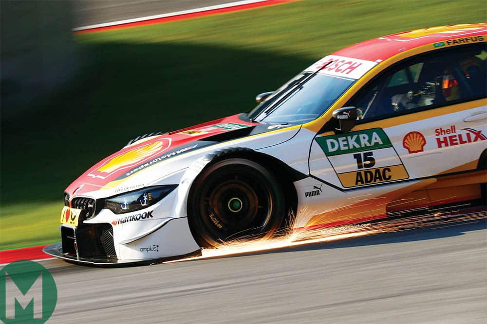 Augusto Farfus’s BMW throws up sparks during a DTM round at the Red Bull Ring, Spielberg, Austria