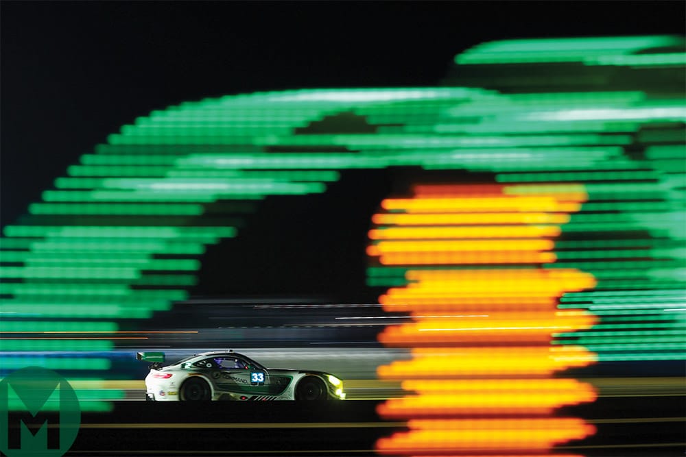 Riley Motorsport’s Mercedes AMG GT3 captured in a blur of light at Sebring