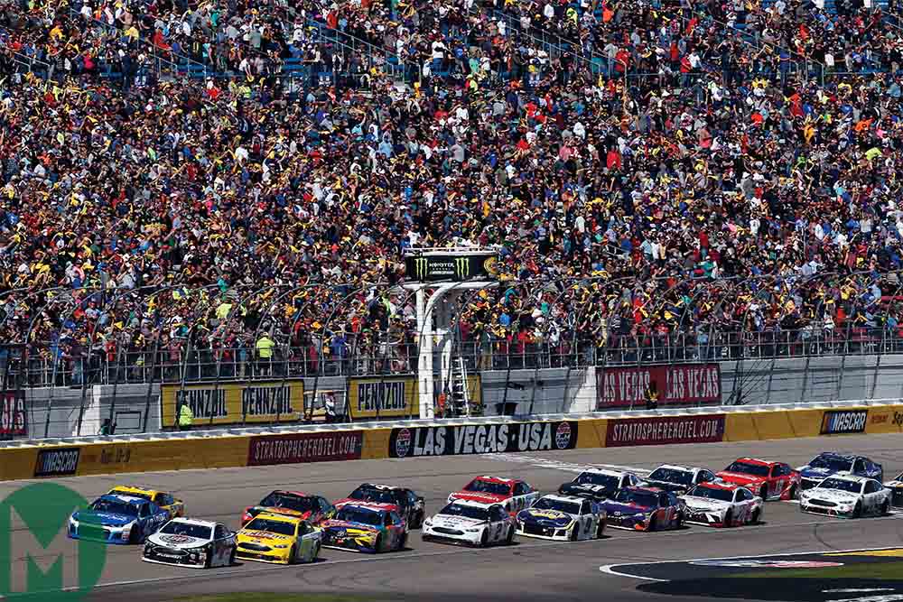 The NASCAR field roars away for the Pennzoil 400 at the Las Vegas Motor Speedway back in March, with Kevin Harvick and Jimmie Johnson leading