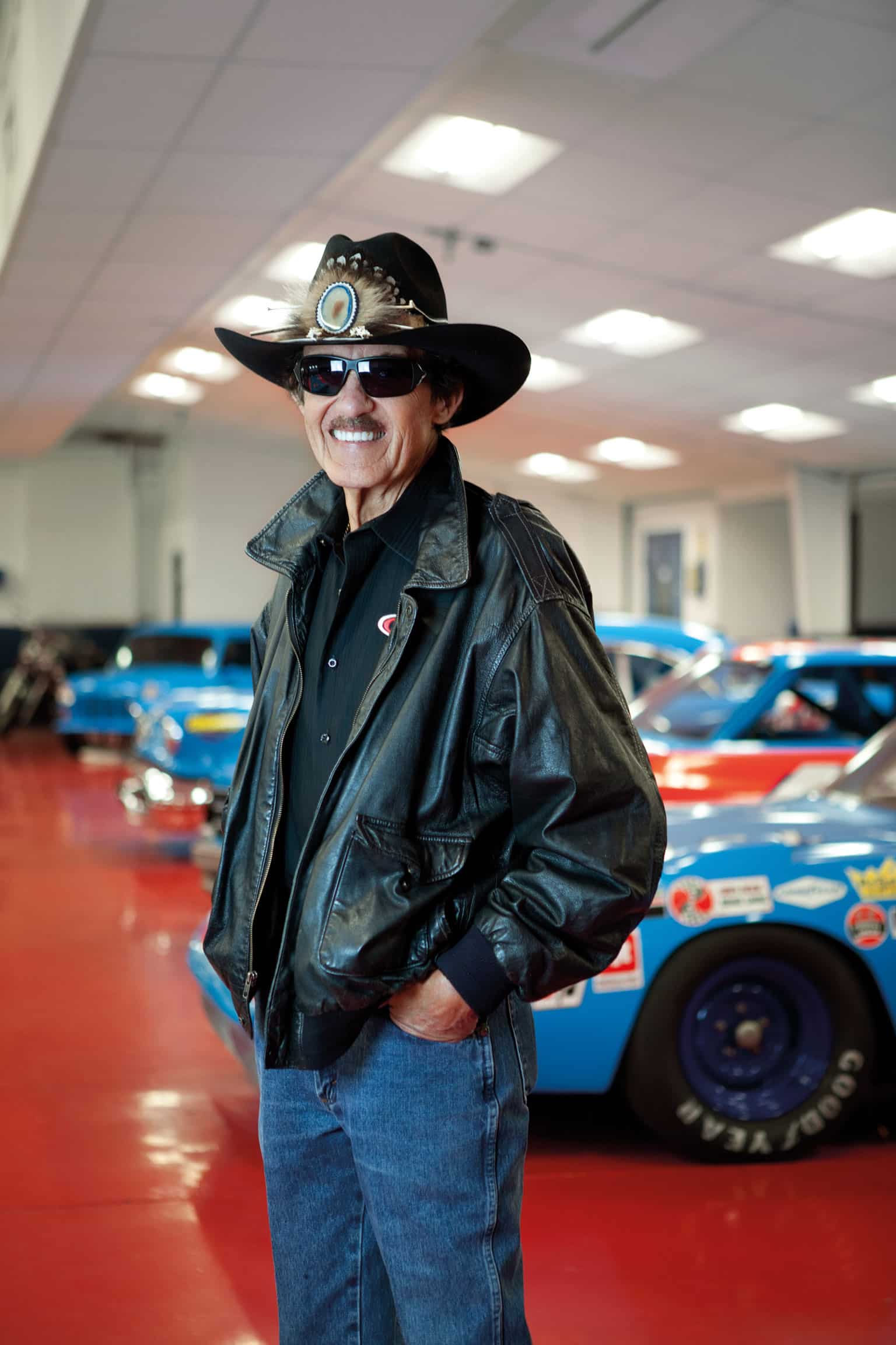 Opposite his grandfather’s humble wooden house where Richard was born in 1937, the workshops of Petty Enterprises now cover a wide area. As I look over the museum line-up of some of the winning cars that have worn that distinctive pale blue colour and that number 43, a tall, upright, rangy figure comes in and shakes my hand with a quiet “Hi”. The outfit is just like all the pictures: high-heeled boots, neatly trimmed moustache, tall cowboy hat, impenetrable dark glasses. He points out some of the cars to me, reminiscing briefly about the achievements of each. One, with severe damage and most of the front apron missing, is the Pontiac he drove in his final race. Caught up in a mammoth pile-up before half distance, he pulled off with his car on fire. Marshals put the fire out and his crew worked feverishly to make it driveable, and with two laps to go he rejoined in the battered wreck to come home, yet again and for one last time, a finisher.
