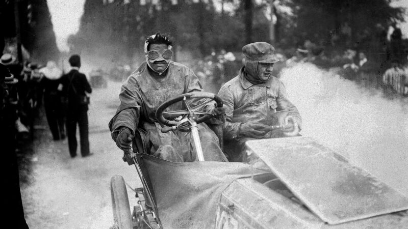 Determination, dust, grit and guts. Arthur Duray in De Dietrich No27 contests the 1905 French Eliminating Trials for the Gordon Bennett race – four laps of the 85-mile Auvergne circuit, total 341.4 miles – for a place in France’s three-car Cup team. In his 17-litre 130hp machine he finished third overall behind the Richard-Brasiers of winner Léon Théry and second-place man Gustave Caillois. Théry averaged 44.9mph for the total distance and set fastest lap at 50mph – you’d be doing well to match that on these roads today.
