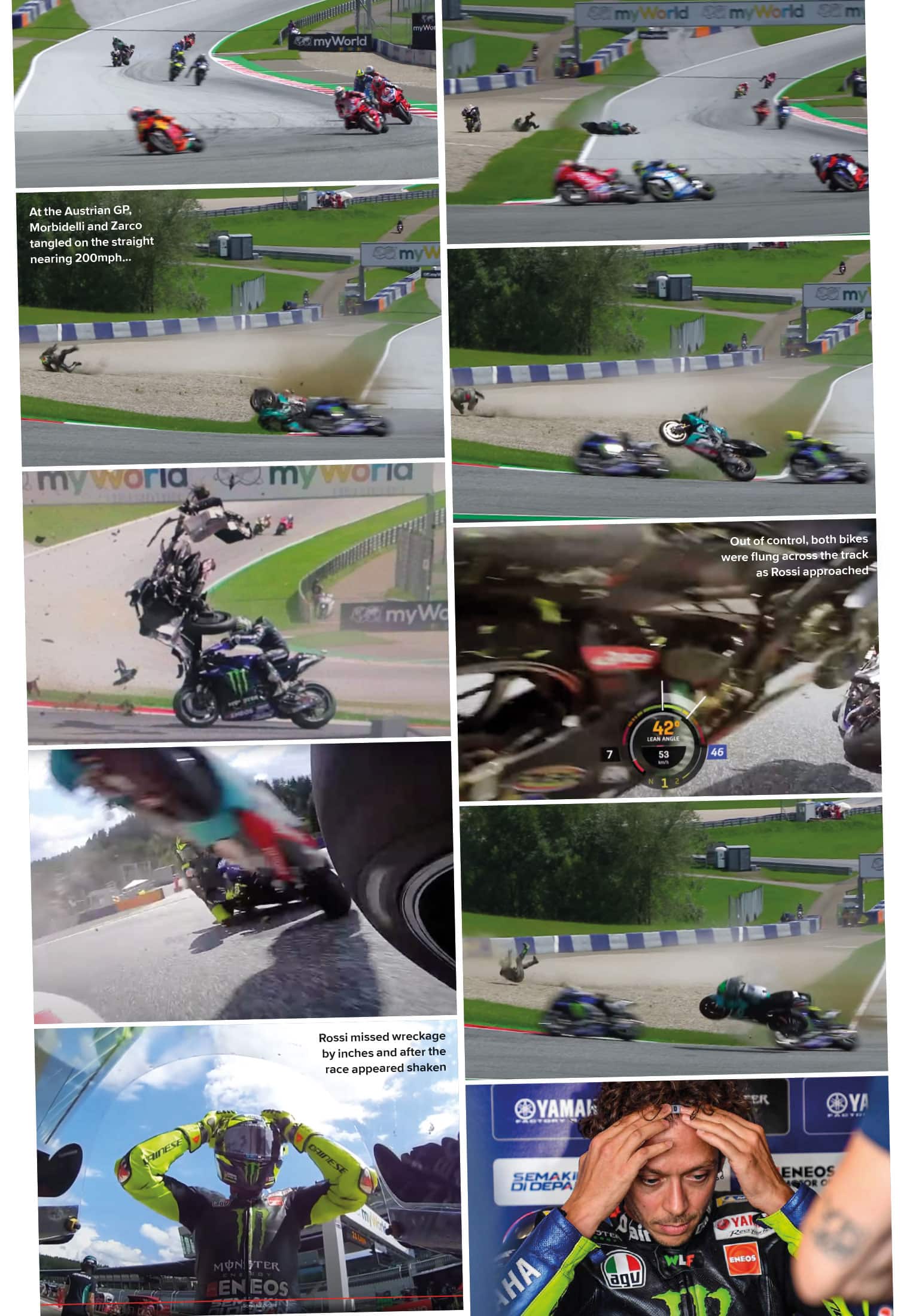 The terrifying moment when the wreckage of Franco Morbidelli’s Petronas-Yamaha flew across the path of Valentino Rossi during MotoGP’s Austrian Grand Prix