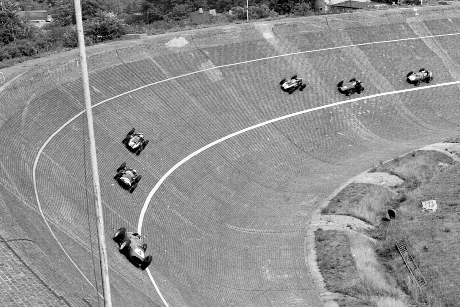 Tony Brooks, Stirling Moss, Masten Gregory, Jack Brabham, Jo Bonnier and Dan Gurney on the banked North Turn.