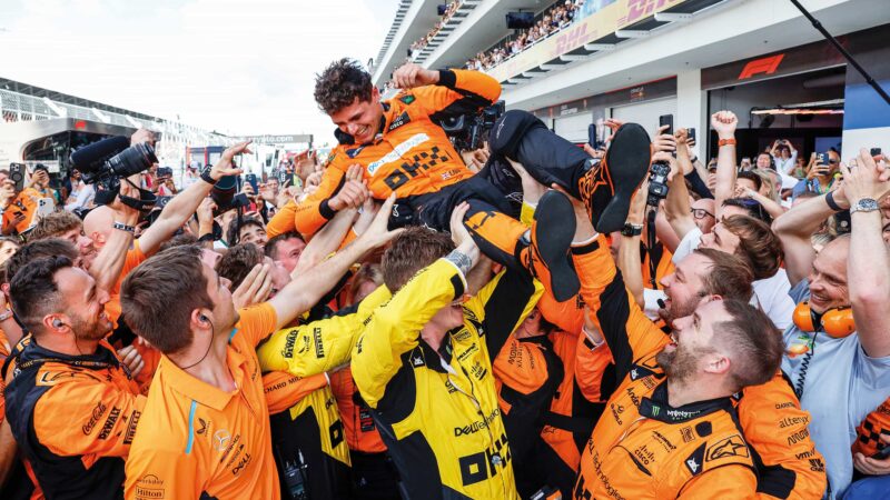 Painting the town, er, papaya. Left: Miami was Lando Norris’s maiden F1 victory.