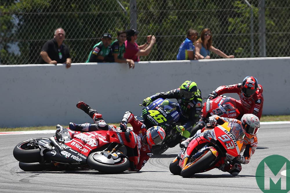 On the second of 24 laps race-winner Marc Márquez out-braked Andrea Dovizioso into turn ten and beat him to the apex; so Dovizioso adjusted his line to prepare his classic undercut manoeuvre. Meanwhile Jorge Lorenzo tried to out-brake third-placed Maverick Viñales and suddenly found himself running out of room, so he squeezed the front brake a bit harder, which locked the front tyre. Down he went, his fallen bike skittling Dovizioso, then Viñales and finally Valentino Rossi.