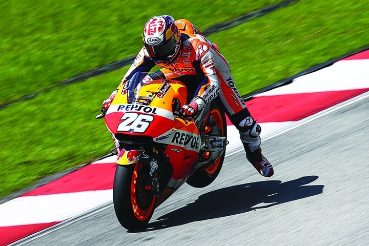 The freak incident that perhaps sums up his misfortune better than any happened during the 2013 Aragon GP, where Márquez made contact with the rear of Pedrosa’s bike as the pair entered a corner. When Pedrosa opened the throttle he was instantly ejected. The minor collision had severed the cable joining the wheel-speed sensor to the bike’s ECU, deactivating its traction control. What are the chances? Last season was ruined by an arm problem that forced him to undergo radical surgery, or quit racing. He missed three races, then won two of the last four.