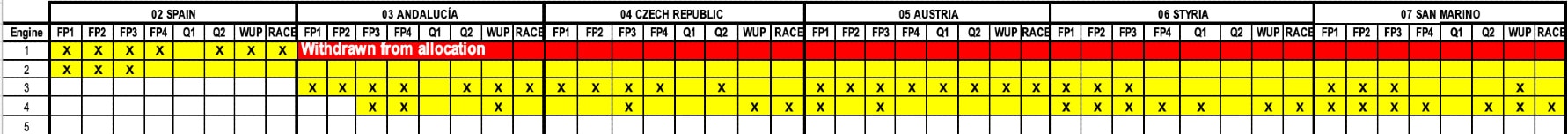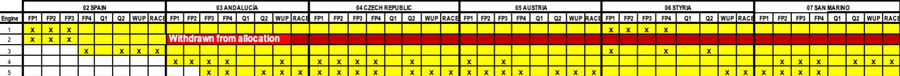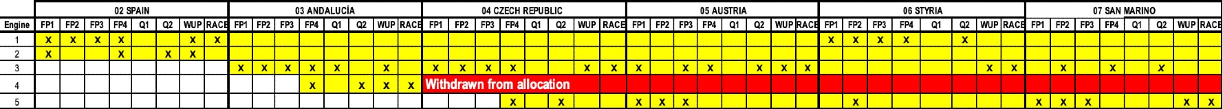 Black cross denotes engine use by event and session. Red denotes engine broken and withdrawn