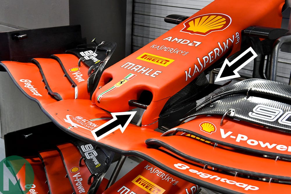 What Ferrari brought to Singapore was an update comprising a new nose, with a miniature version of the Mercedes-style ‘cape’ beneath, at the back of the nose, where it transitions towards the barge boards. This replaced the slotted vane that sought to keep the flow to the underfloor consistent as the car – and thus the airflow – changed direction.
