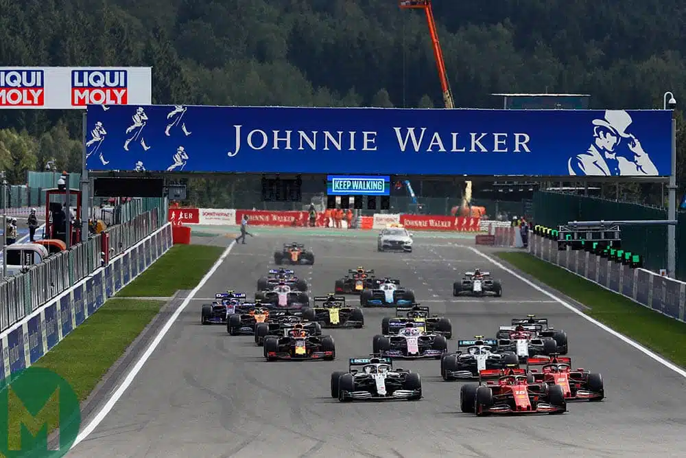 The race began with a safety car, when Max Verstappen clipped Kimi Räikkönen at the La Source hairpin at the end of the pit straight. The collision broke his steering column, and Verstappen speared into the barriers at the high-speed Eau Rouge bend.