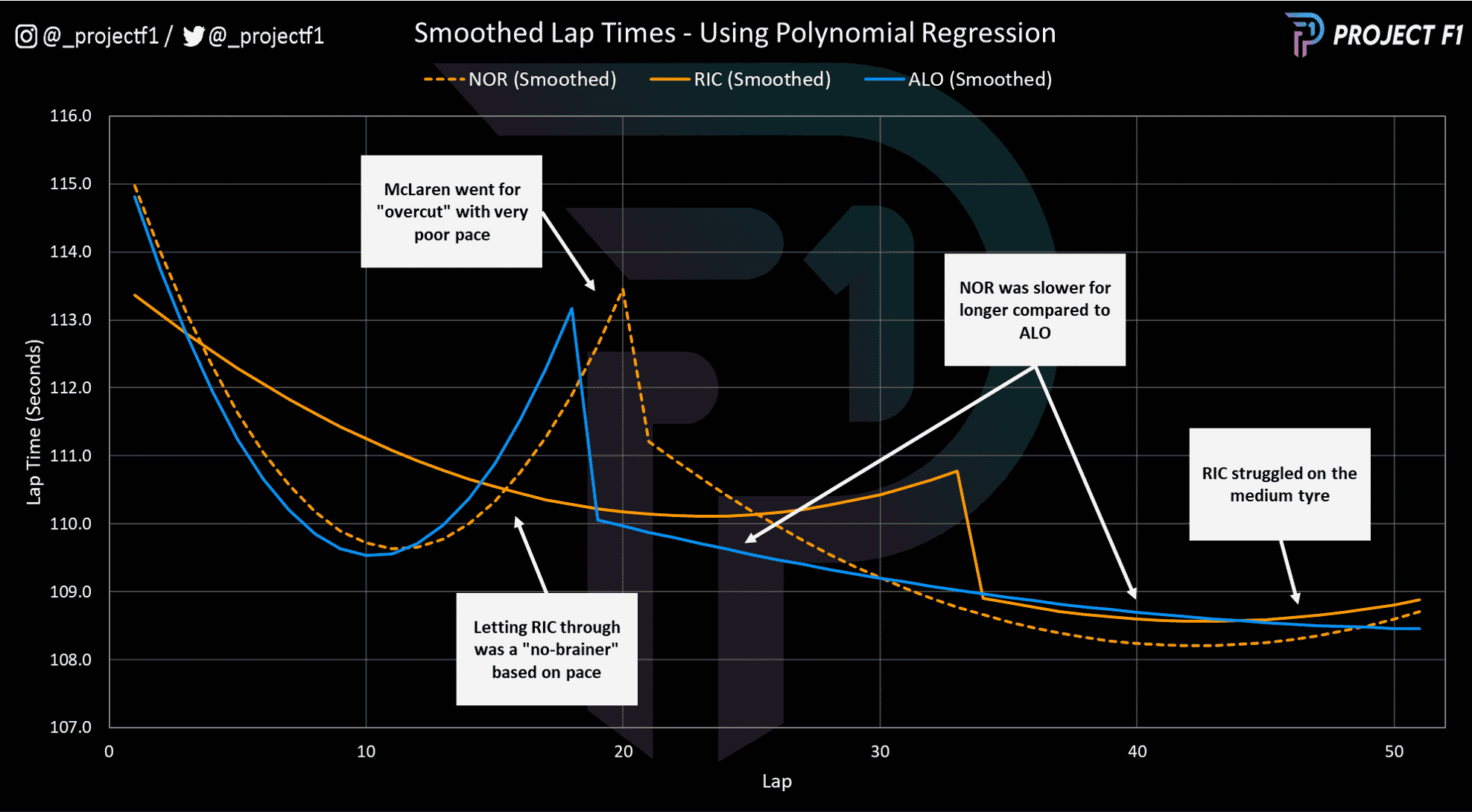 As shown above, Alonso pitted on lap 18, prompting Norris to go on for an overcut attempt and pit two laps later. This meant that Ricciardo had to hold position behind his team-mate for four laps out of 51 (eight per cent of the race) – sacrificing potential pace and race time.