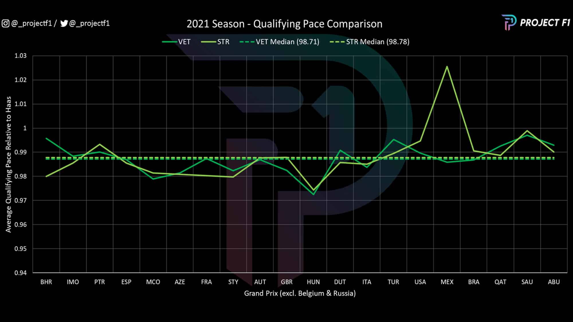 On average, Sebastian Vettel just about edged the qualifying battle in terms of pace but was comfortably the victor in the overall head-to-head with Lance Stroll (14-8 in Vettel’s favour).