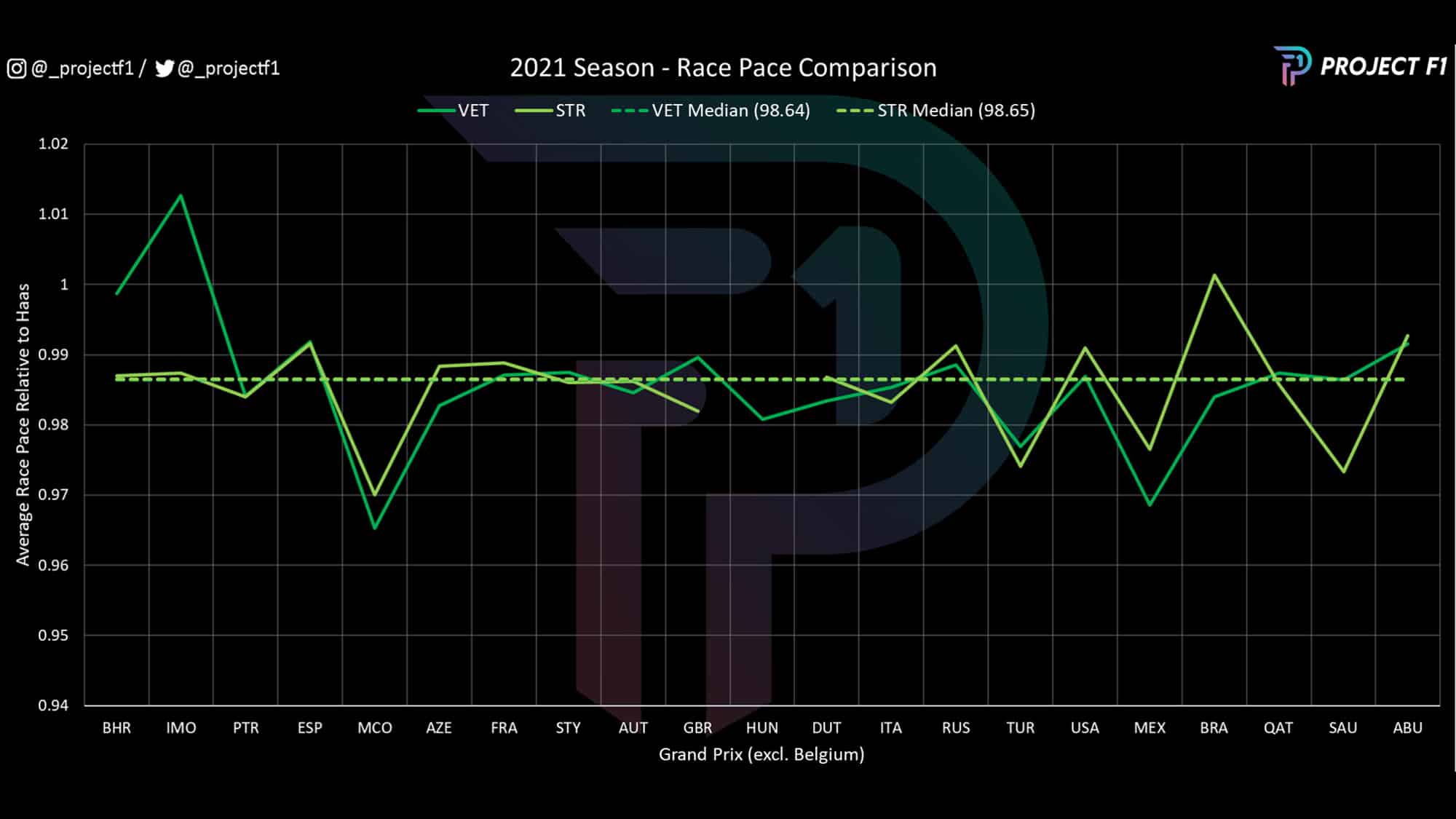 While the race pace battle was closer, it was Vettel that achieved the standout results, finishing further up the order than Stroll while the Canadian was more consistently in the points, albeit in the lower paying positions.
