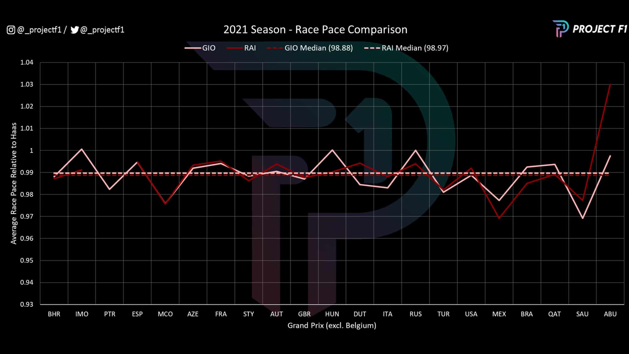 While they ended up tied at 10 apiece in terms of race results (discounting the Dutch and Italian GPs which Räikkönen missed due to COVID), the Italian was actually the better performer on race day on average.