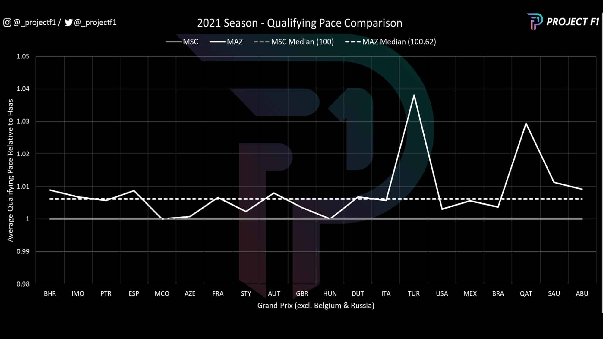 Nikita Mazepin struggled to form any kind of consistency against his team-mate throughout the year and while he came close on a few occasions, the qualifying battle ended up 20-2 in Schumacher’s favour.