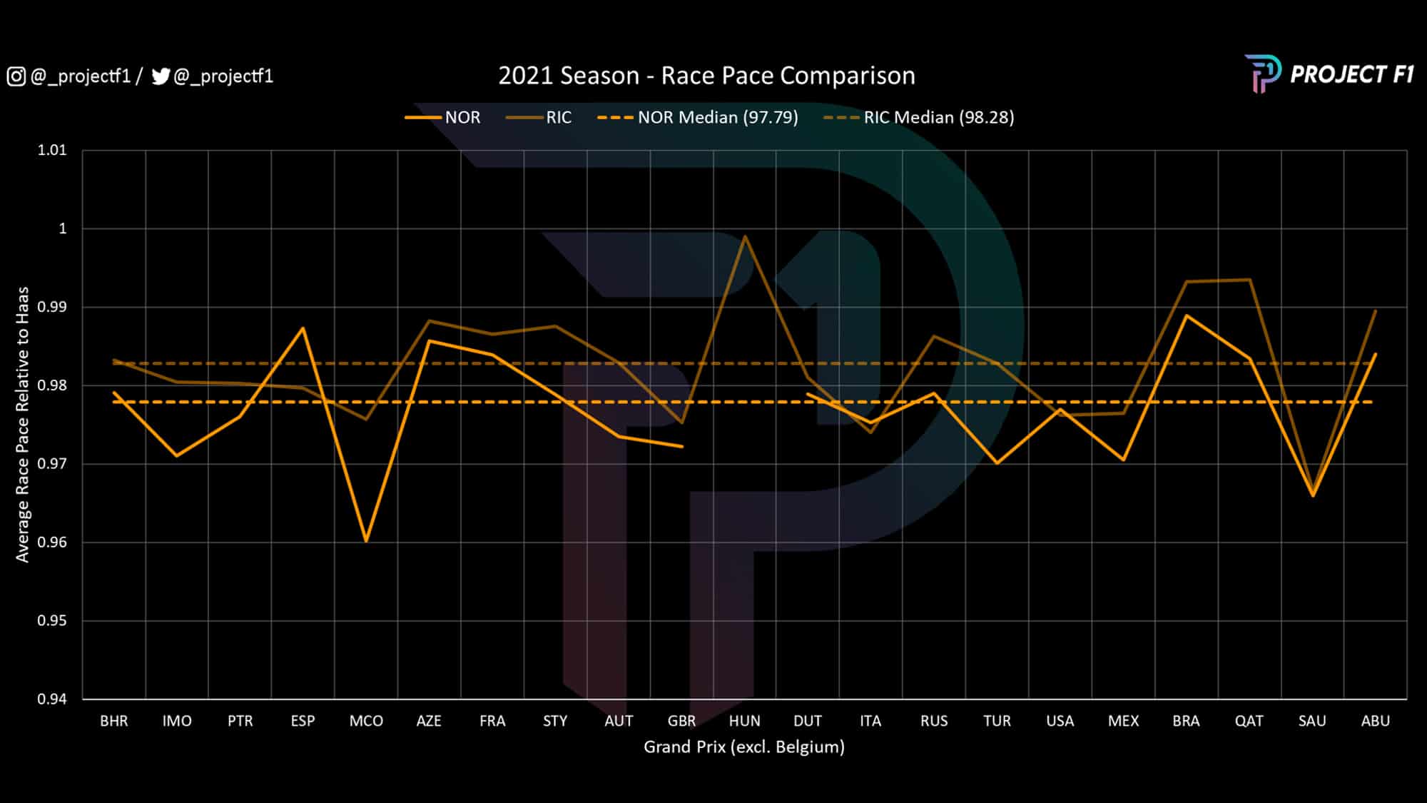 Ricciardo’s race pace did improve gradually through 2021 though he won’t be thrilled with the gap that he had to his team-mate on a Saturday.