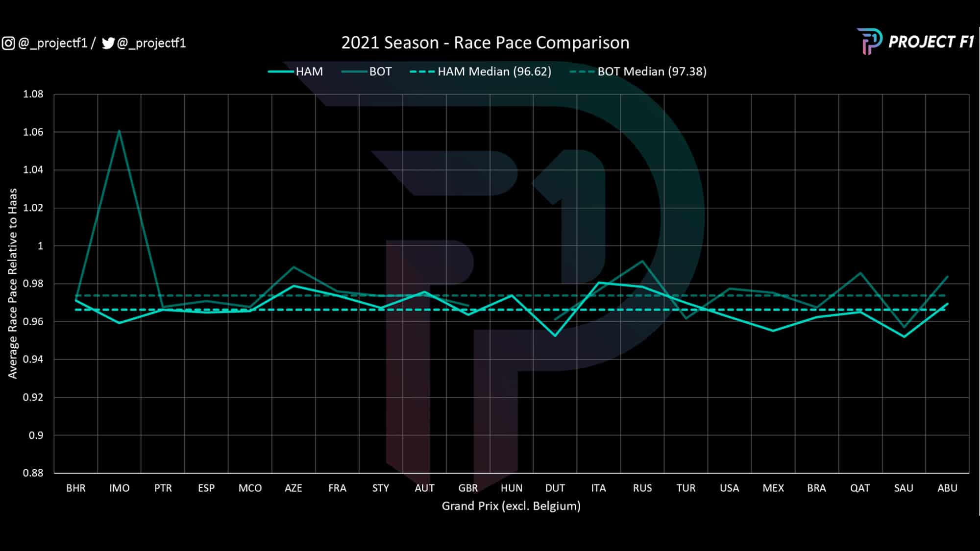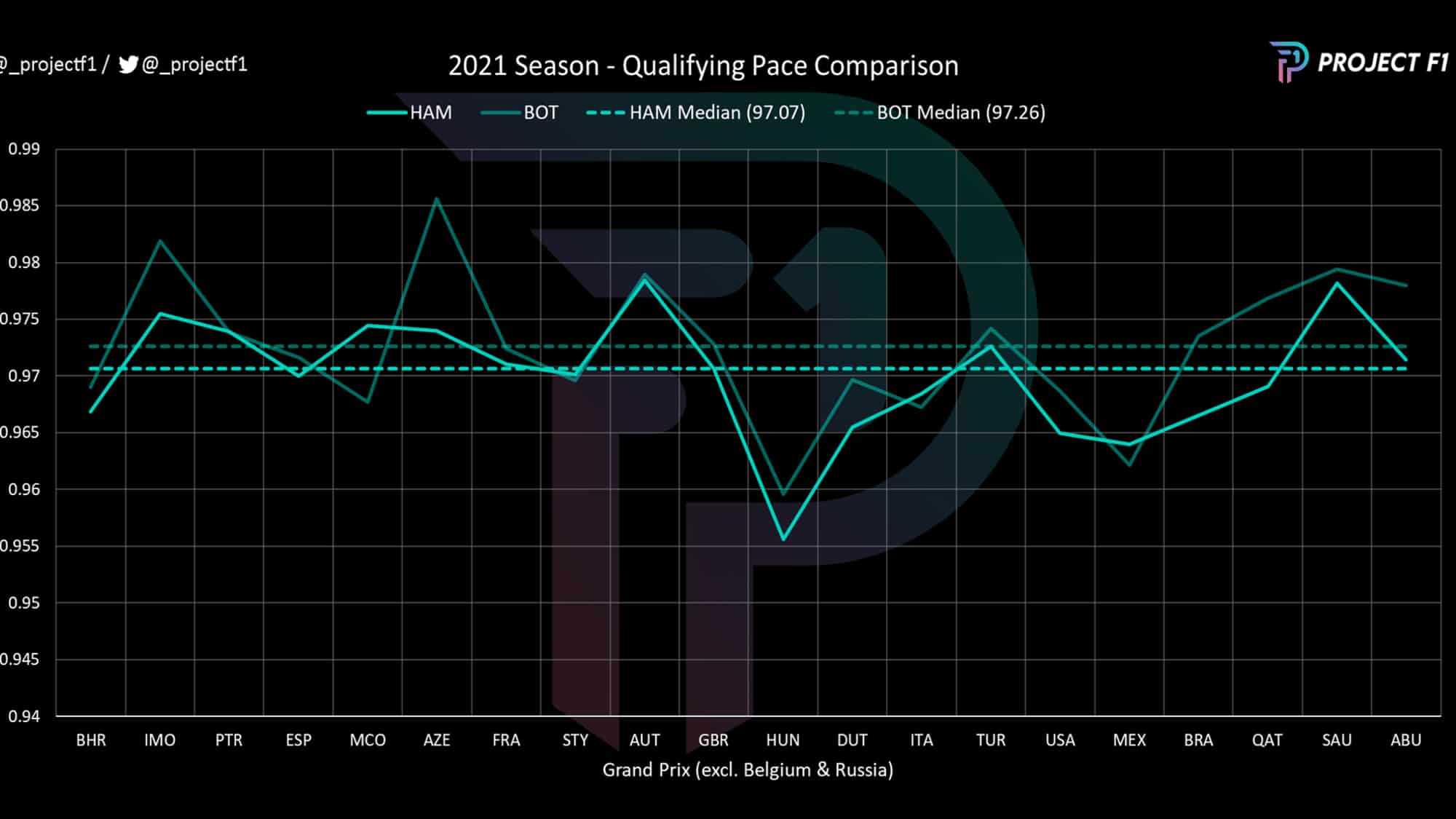 · Bottas performed better in qualifying relative to the races but still failed to consistently give Hamilton a run for his money