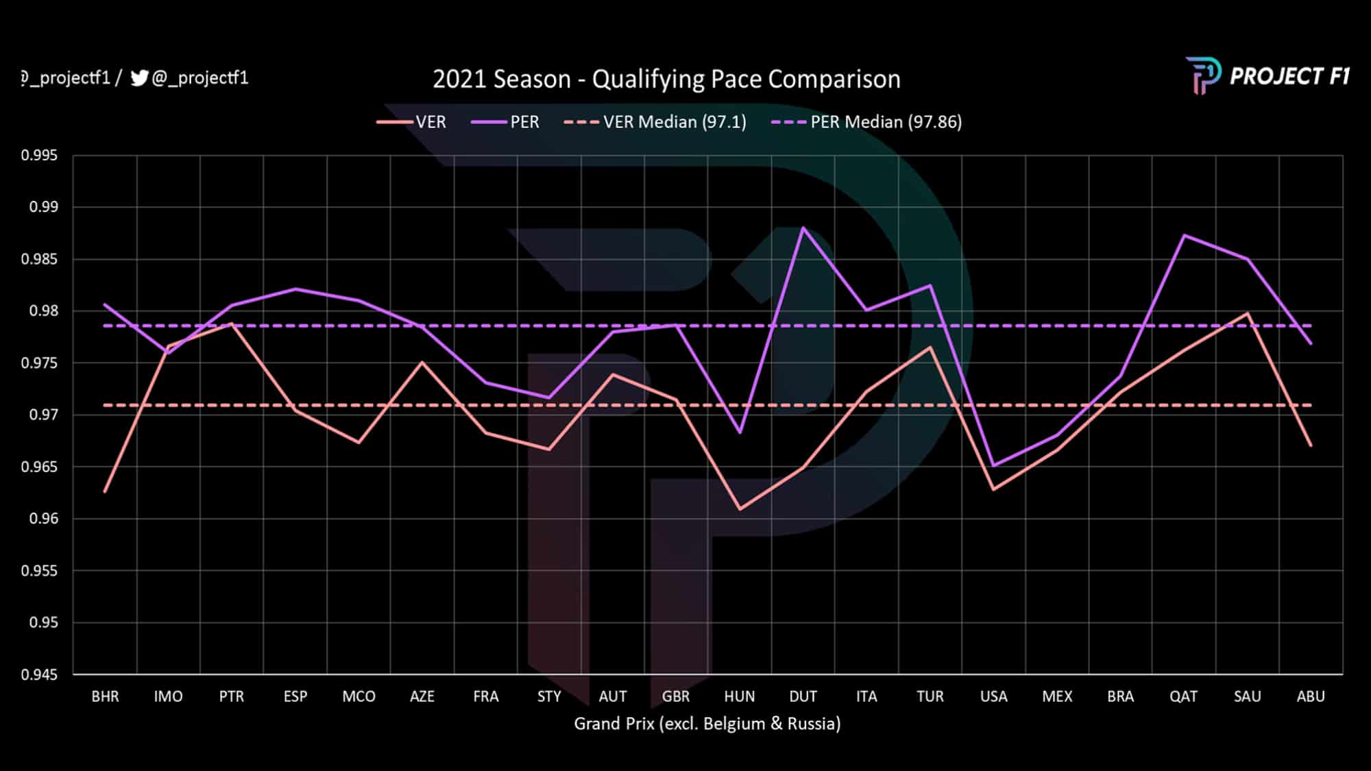 Evidenced in the qualifying pace chart outlining the team’s qualifying benchmarks, the Mexican achieved the better result on Saturday just once all season on pure pace.