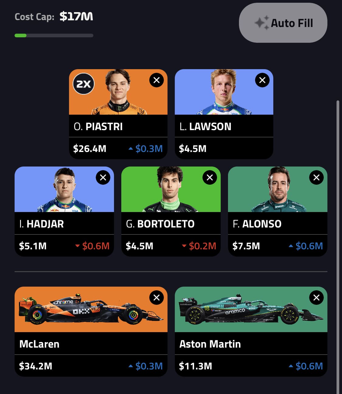 Behind them it’s the likely lads. Liam Lawson ($4.5m) and Isack Hadjar ($5.1m) both represent excellent value for money with both having the potential to score a handsome Fantasy points return compared to their value.