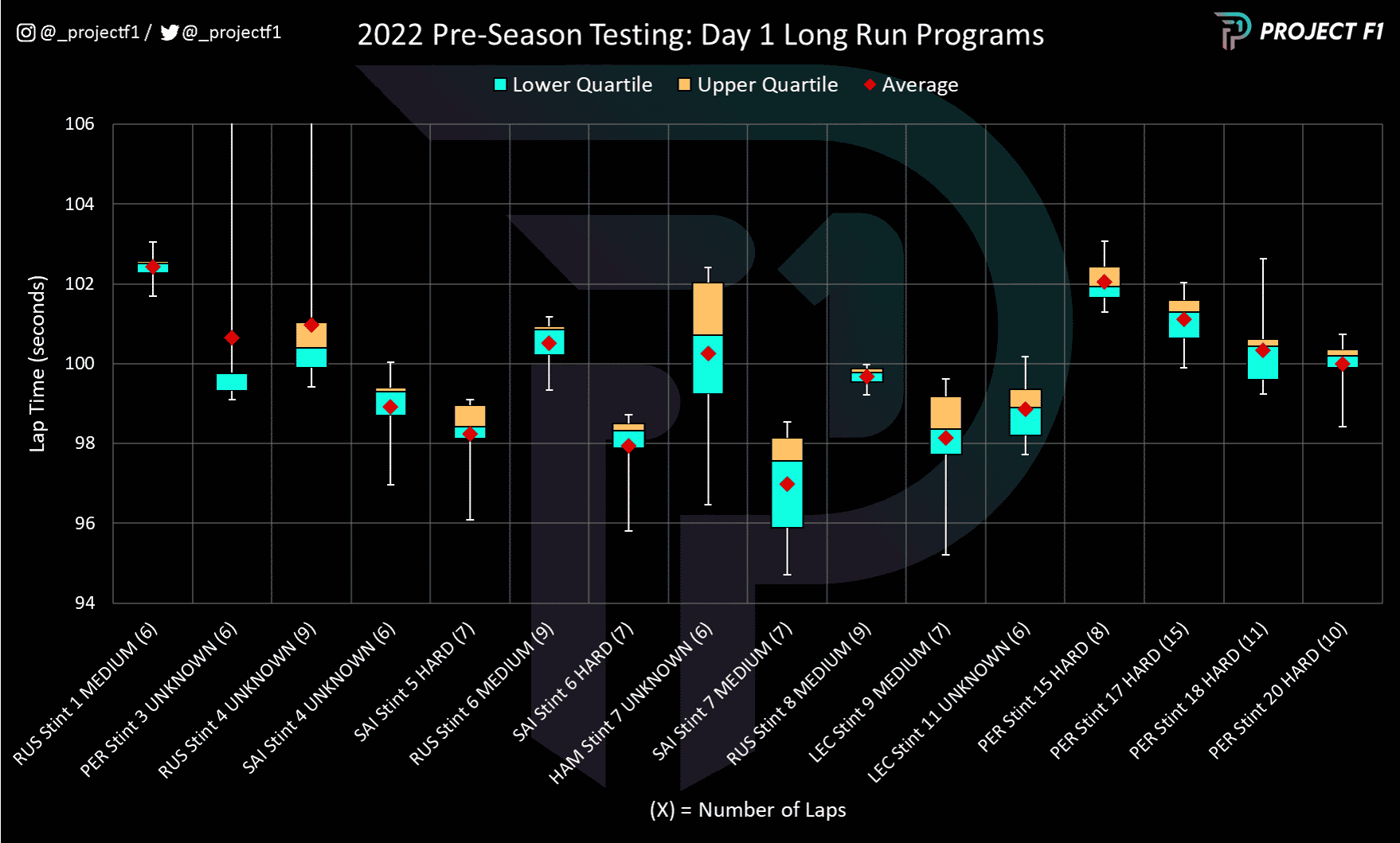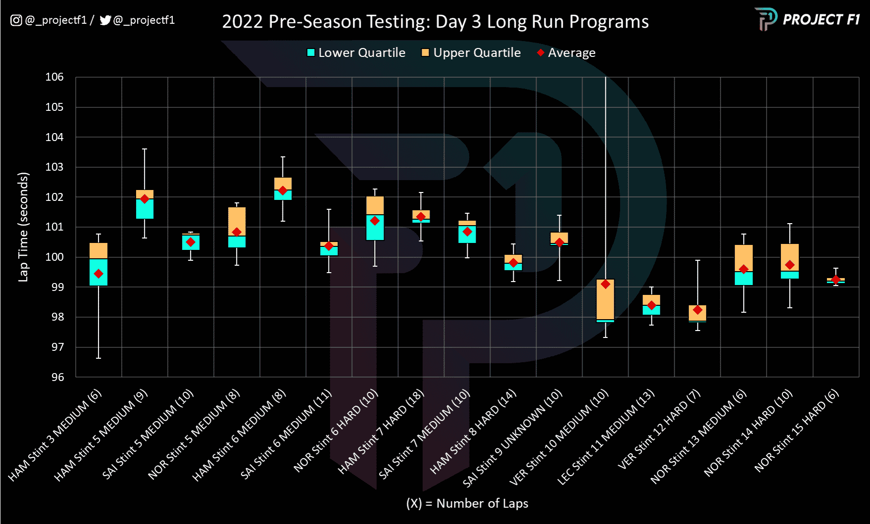 While there is a lot of time for testing, there is not that much time that is spent on long runs alone, which can indicate race pace. This analysis has looked to collect the most notable stints across each of the three days of testing for the “top” teams.