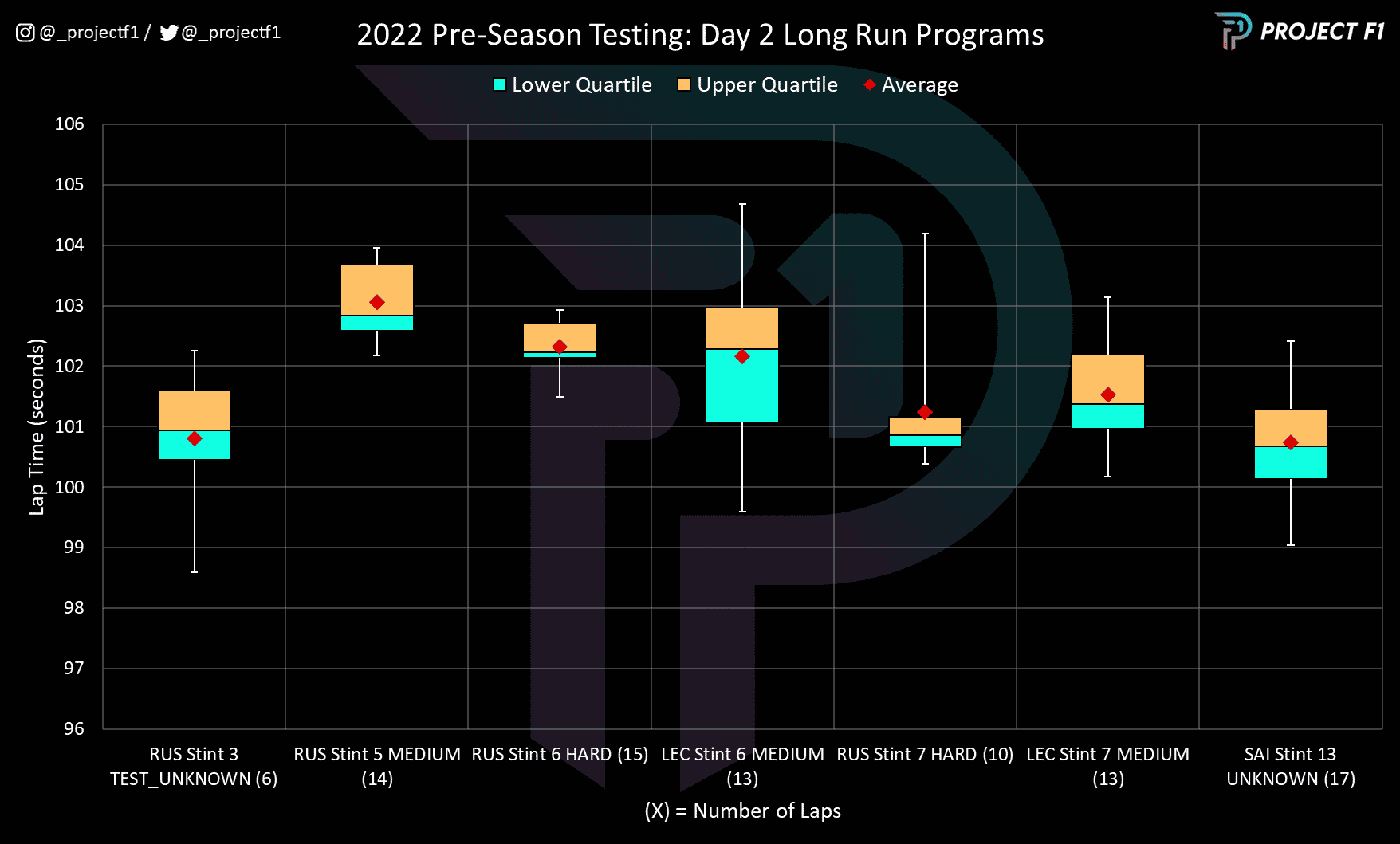 Russell’s efforts are interesting to note. The tightness in the bands were very consistent and he showed reliable pace in these programs – especially compared to the Ferrari. This is meaningful as more time on track for long run sims means the team didn’t have to spend as much time with setup configuration to find confidence and be on the pace.