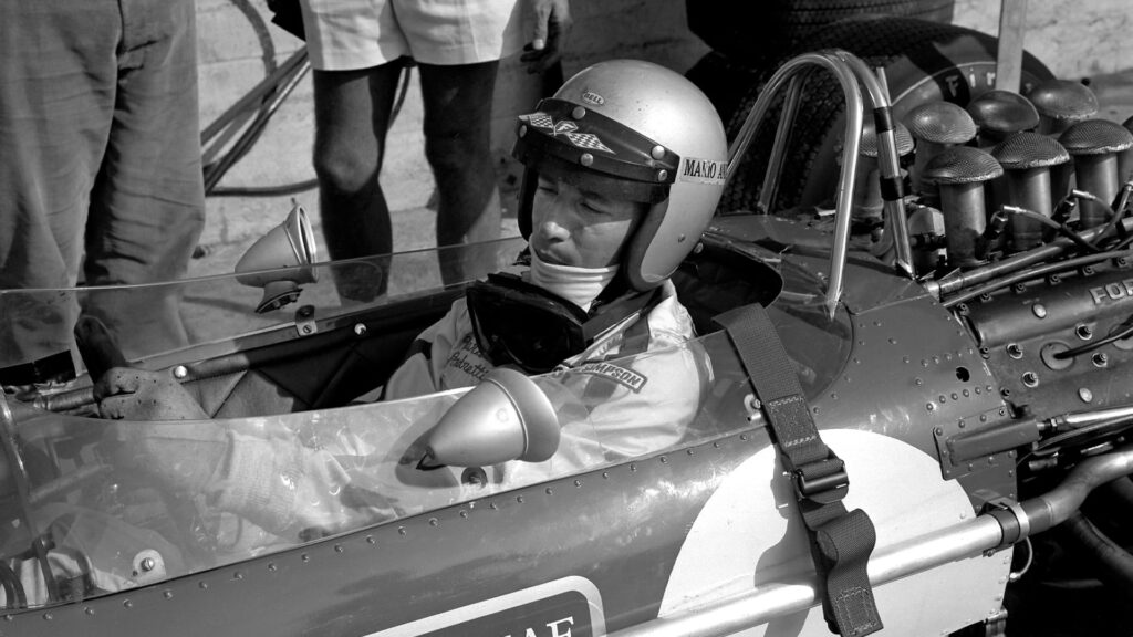 32 laps earlier, the American had arrived at his home race for the first time after convincing Lotus team boss Colin Chapman that he was ready for an F1 seat. Racing alongside Jo Siffert and Graham Hill, who would clinch the world title that same year, Andretti shocked the paddock by taking pole position – beating reigning world champion Jackie Stewart to boot.
