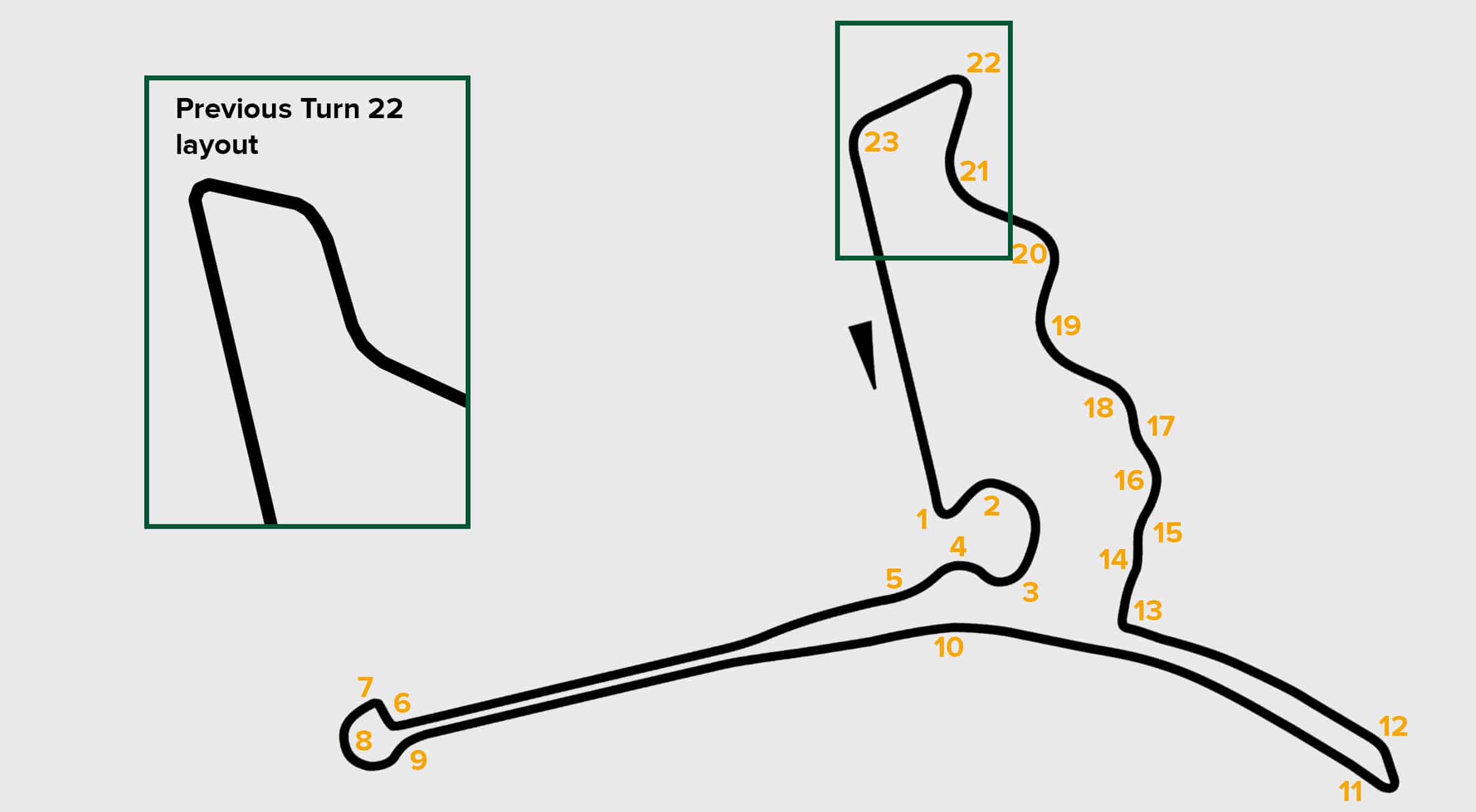 Alterations have been made in between the original Turns 21 and 22, increasing the lap distance from 3.458 to 3.484 miles.