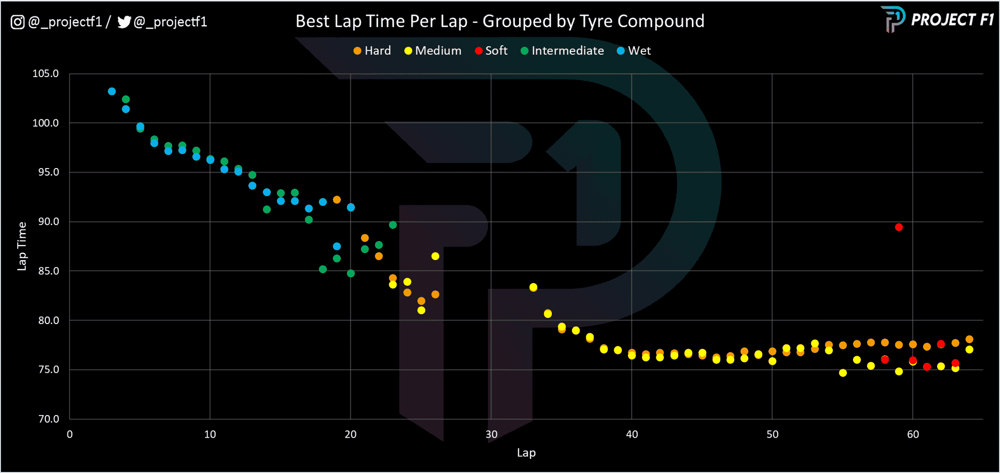 The above graph shows the best lap time per lap, grouped by tyre compound.
