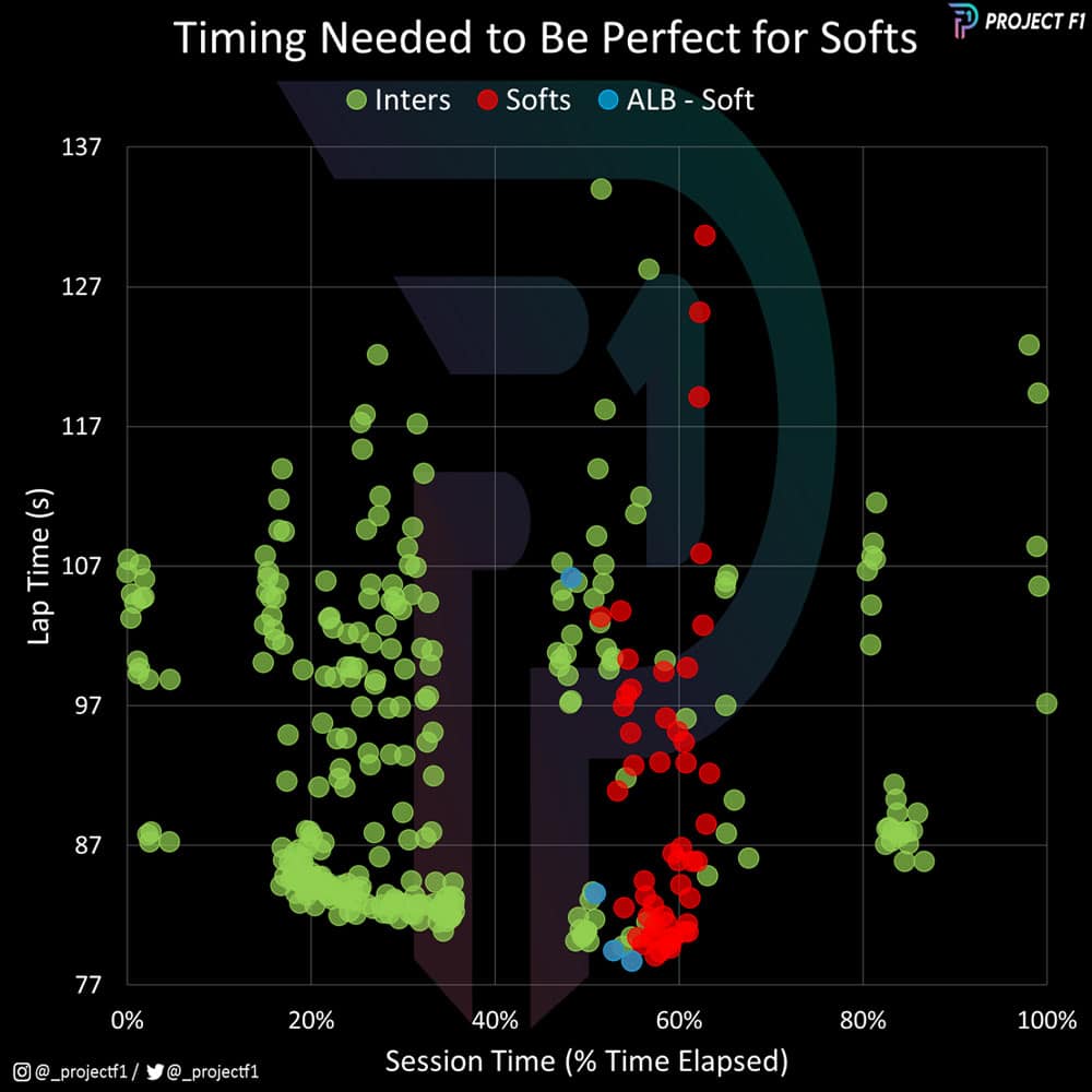 Albon had a few laps to find grip while building tyre temperature. This placed him in the perfect window to set a hot lap for when the soft tyre suddenly became overwhelmingly faster than the intermediates – his Q2-topping time was 0.6sec faster than anyone else.