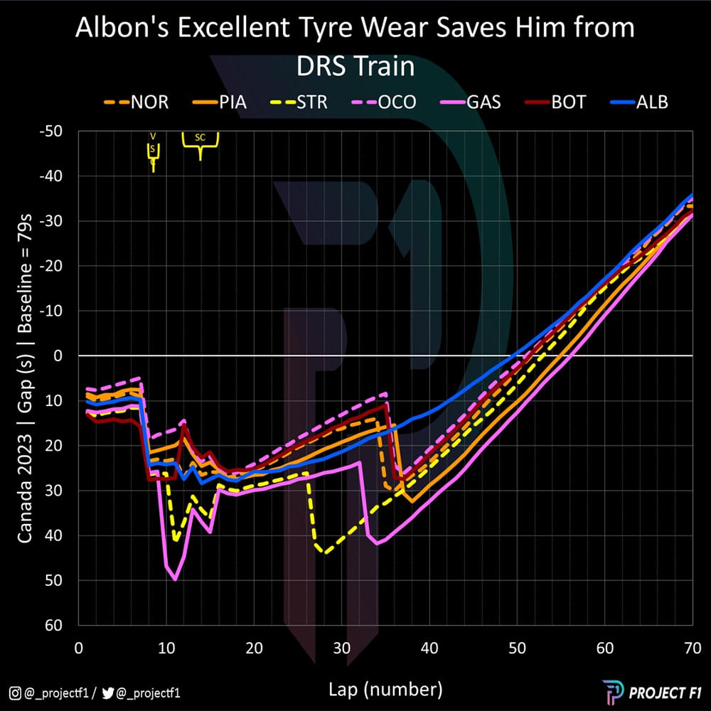 Taking a close look at laps 34-36 shows that Albon began closing in on Piastri again, with the Williams faring well in traffic. Piastri then pitted, as did the likes of Ocon, Bottas and Norris, gifting Albon clean air and allowing him to put some distance between himself and his peers.