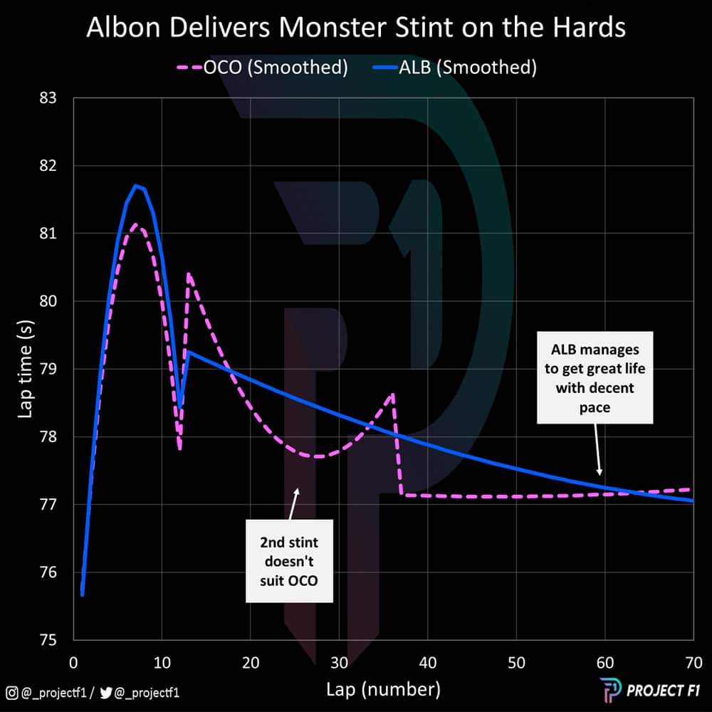 When George Russell hit the wall on lap 12, several drivers took the opportunity to come in for tyres under the safety car. Going for a one-stop from lap 12 was aggressive even by Pirelli’s estimations, but Albon managed to look after his tyres for 58 laps and make it work. No other driver on a successful one-stop strategy stopped anything like as early.