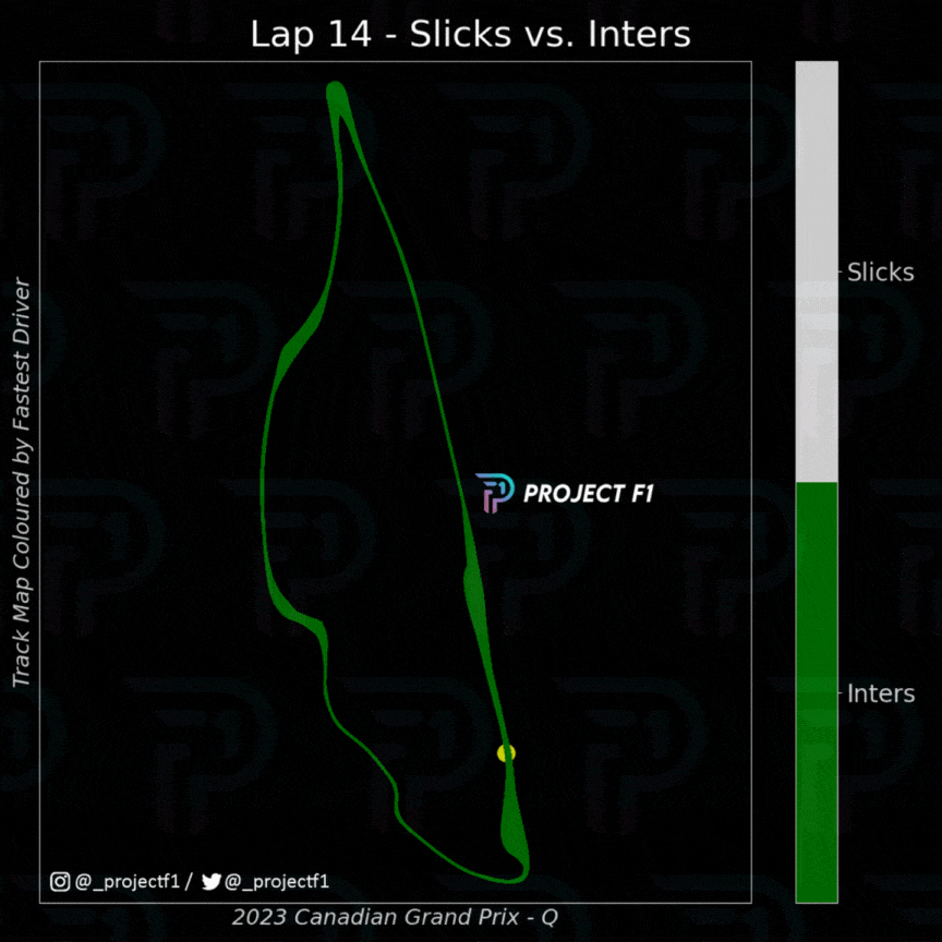 As soon as the Williams driver set his 1min 18.725sec Q2 hot lap (the fastest lap of the qualifying session) the track conditions started to deteriorate as shown by the upward trend in the red dots.
