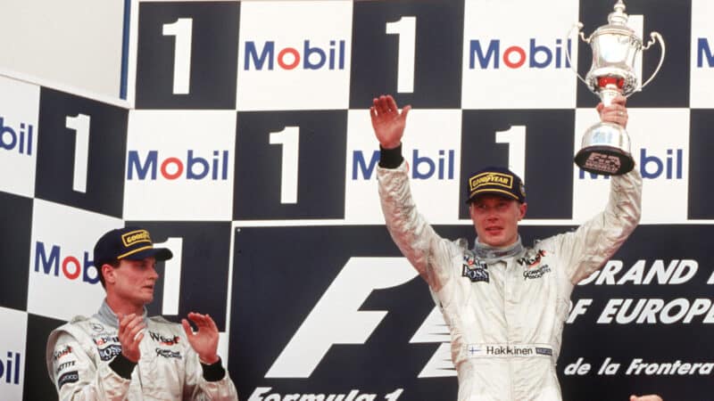 David Coulthard looks on, having moved over to hand Mika Häkkinen victory at Jerez in 1997