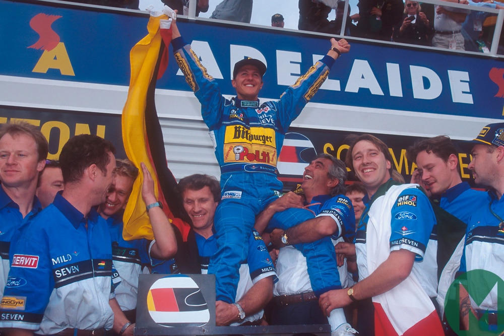 Schumacher took his first world title in 1994, after a controversial collision in the final race of the season in Adelaide, Australia. His Benetton hit Damon Hill’s Williams, forcing both drivers out of the race and making the German champion by default.