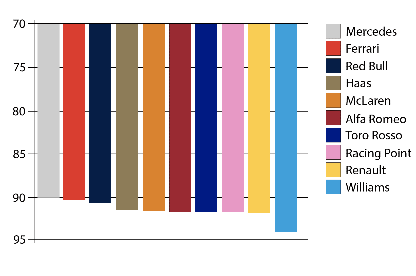 A graph can explain competitive reality far more readily than words, which can then be used just to provide the required perspective and context. So let’s take a look at some numbers from the season so far, with the emphasis on where each team is at, as opposed to the driver contests within.