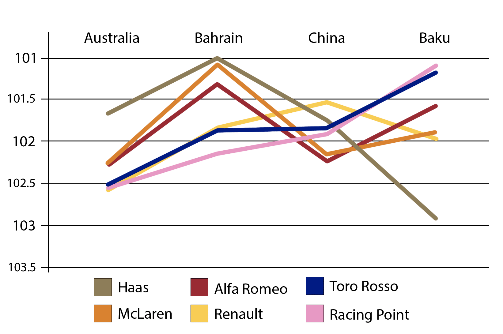 The third graph shows the dramatic fall from contention of Haas in Baku as it struggled even more than usual for tyre temperatures. What is also evident is the steady, continuous progress made by Racing Point, though that’s something that is probably flattered slightly by the most recent race being at a venue where the team (with whatever label) always shines.