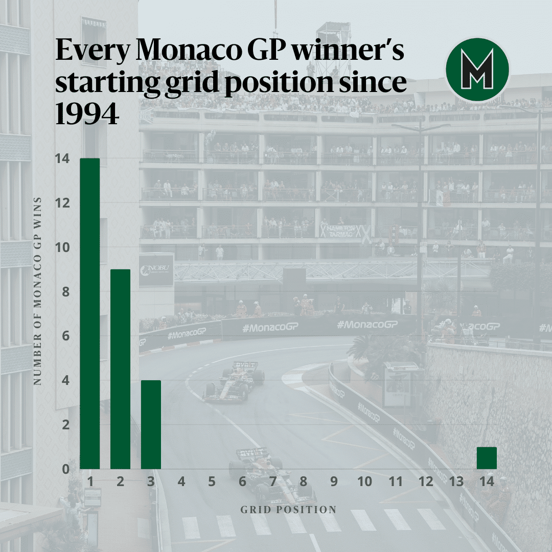 And as our chart below shows, if you don’t start in the top three then your chances of winning are minimal — unless your name is Olivier Panis, whose charge from 14th to first in 1996 remains a legendary Monaco tale.