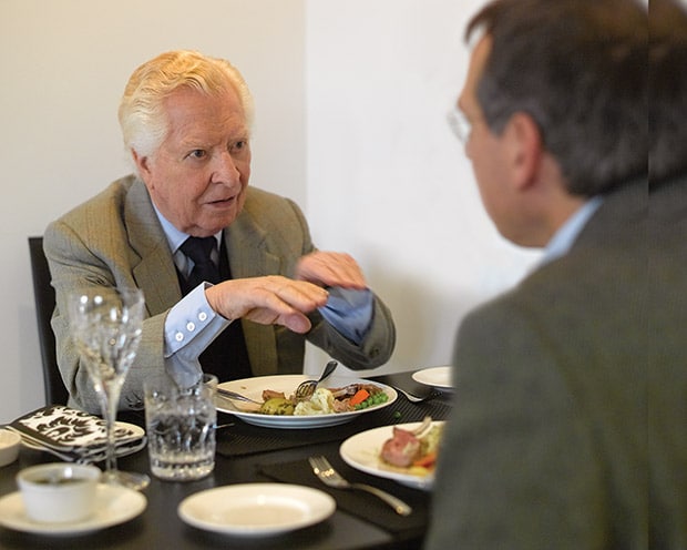 Today, still immaculate himself, he looks decades younger than his age, which unbelievably is 87. His memory for detail is sharp, his delivery staccato and humorously deadpan. He and his wife Ellie live in Monte Carlo now, but their UK base is an elegant lakeside apartment, where Ellie serves us a beautifully presented, and very English, lunch of lamb chops and cheesecake.