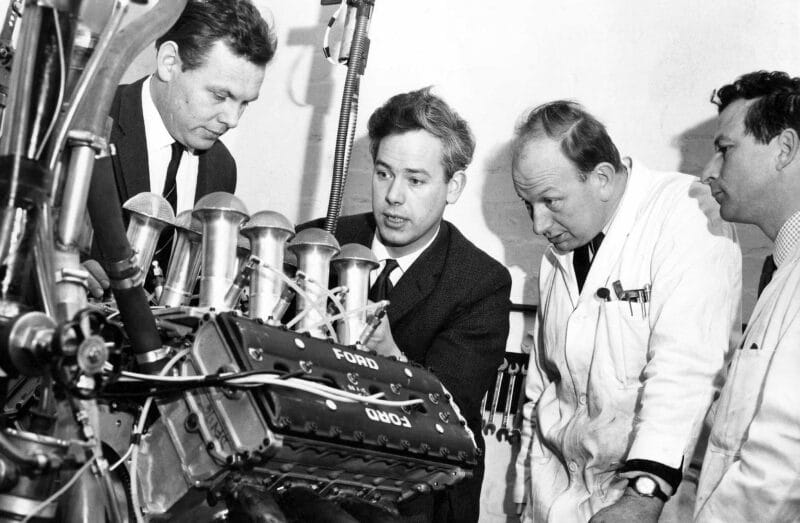 Developing an all-new engine has never been a cheap endeavour and Chapman went off to try and raise funds, but pleas for government backing fell on deaf ears while Ford did not wish to enter Formula 1, despite its existing ties to Lotus. As a stopgap, Chapman made a deal with BRM to use its H16 while he continued the search for cash. Enter Walter Hayes, then head of public affairs at Ford of Britain, who knew Chapman well. He would bring Ford back into the game, convincing the UK operation to stump up the £100,000 needed at the end of 1965. The deal was that Cosworth would build a 3.0-litre F1 V8 and the 4-cylinder F2 motor. Duckworth and Costin had not been idle and by mid-’65 work was already underway on the latter, called the FVA, which would enter competition in 1966.
