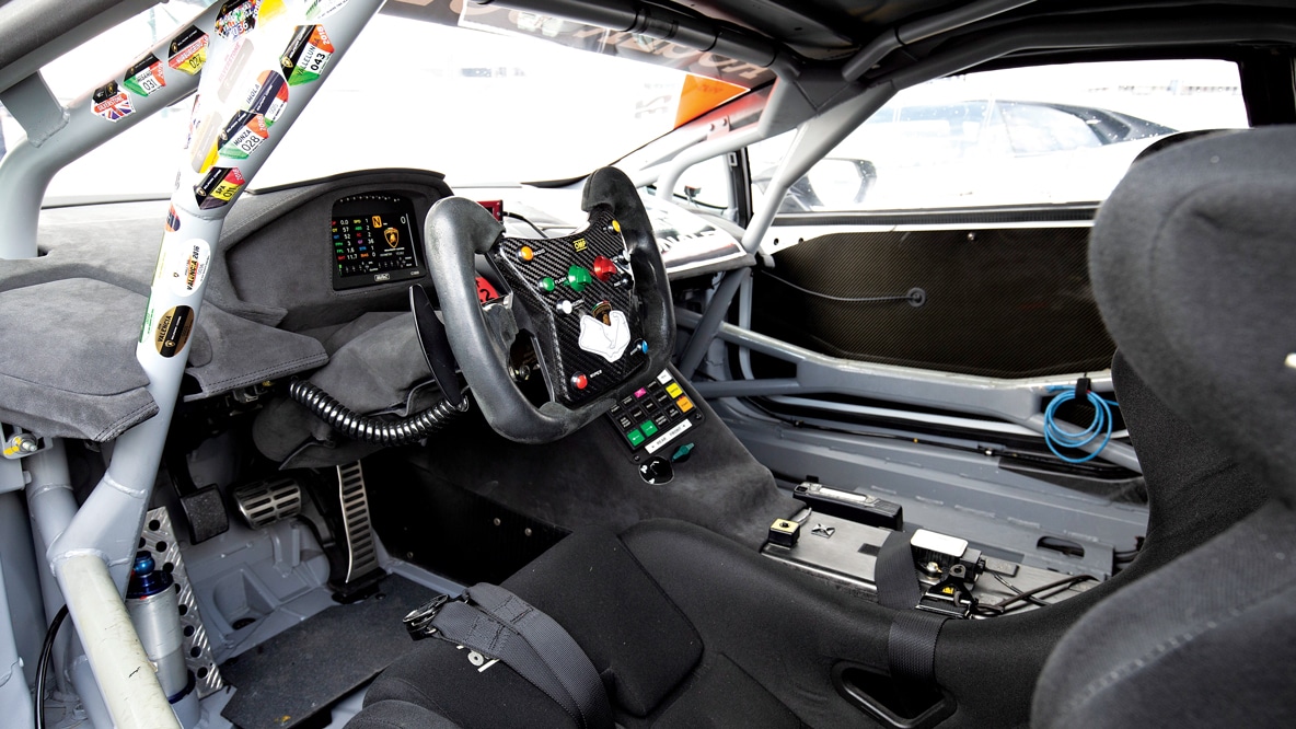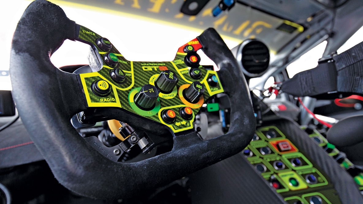 The Huracán GT3 has proven successful across all classes of the Blancpain GT Series; Pro, Silver and Am. Above right: there’s a big step up in driving complexity with the GT3, with more modes, settings and screens