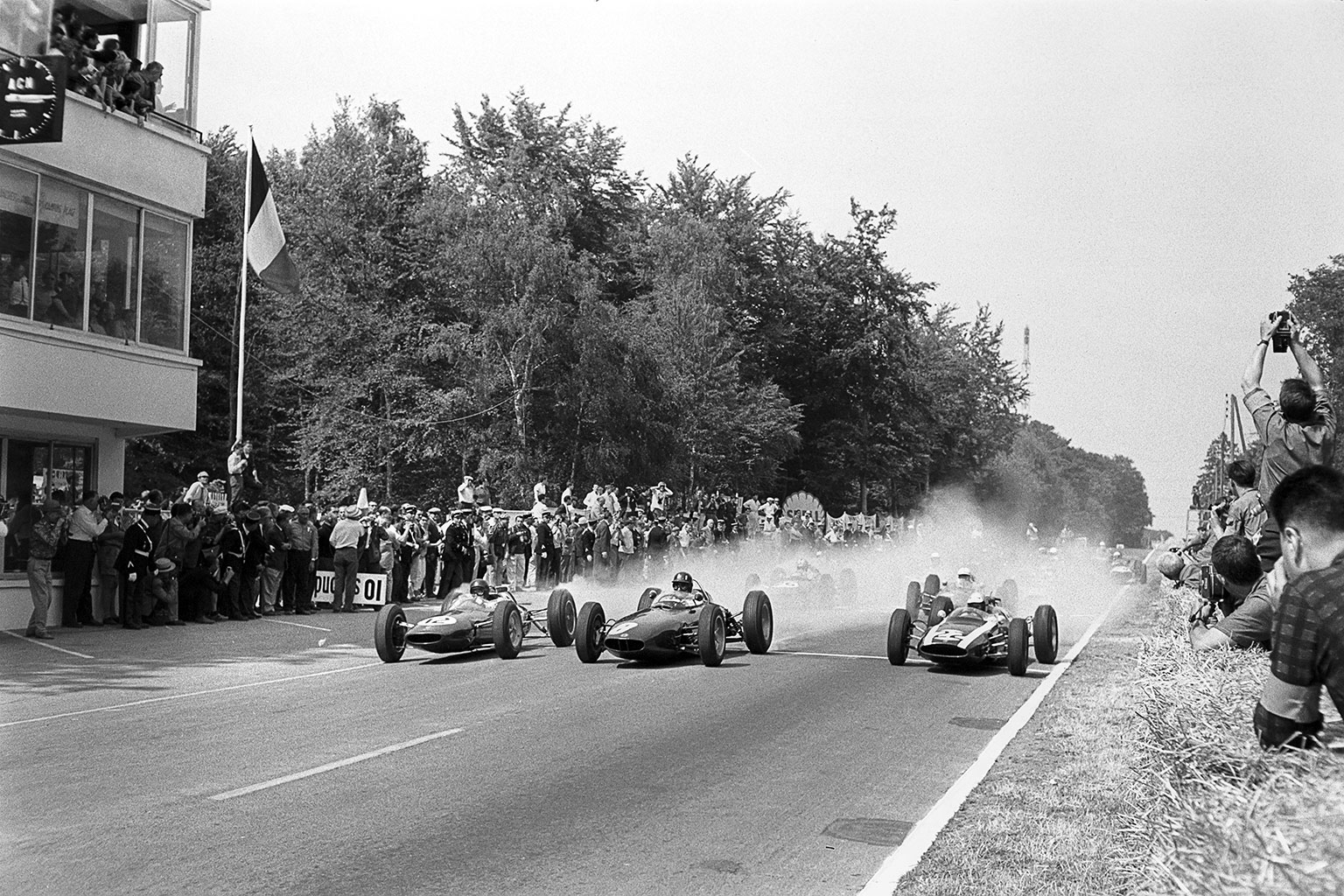 Clark, Hill and McLaren on the front row could see little of this drama and were anxiously peering into their mirrors, so it was not surprising that all three made poor starts when the flag finally fell. Lotus, BRM and Cooper all hung for a moment with wildly spinning rear wheels, and as all three backed off and got grip simultaneously they shot forward in a haze of rubber smoke and disappeared down the hill; through the fast swerves to the Nouveau Monde hairpin.
